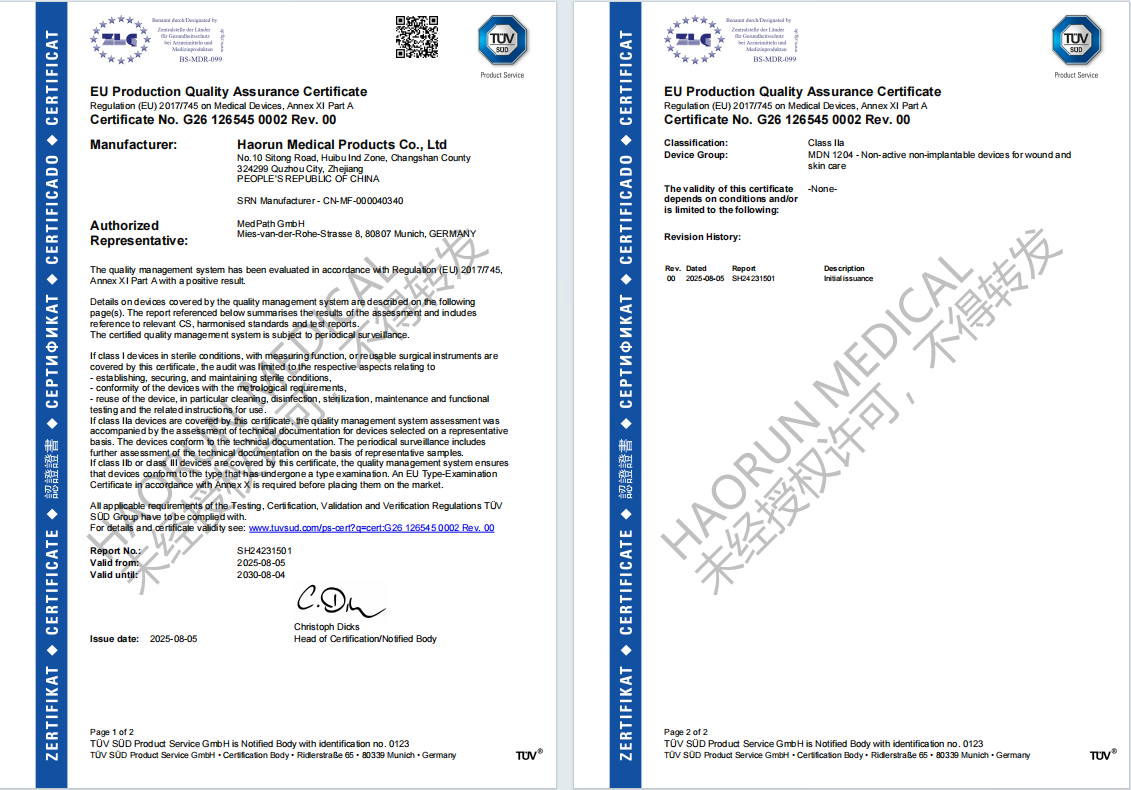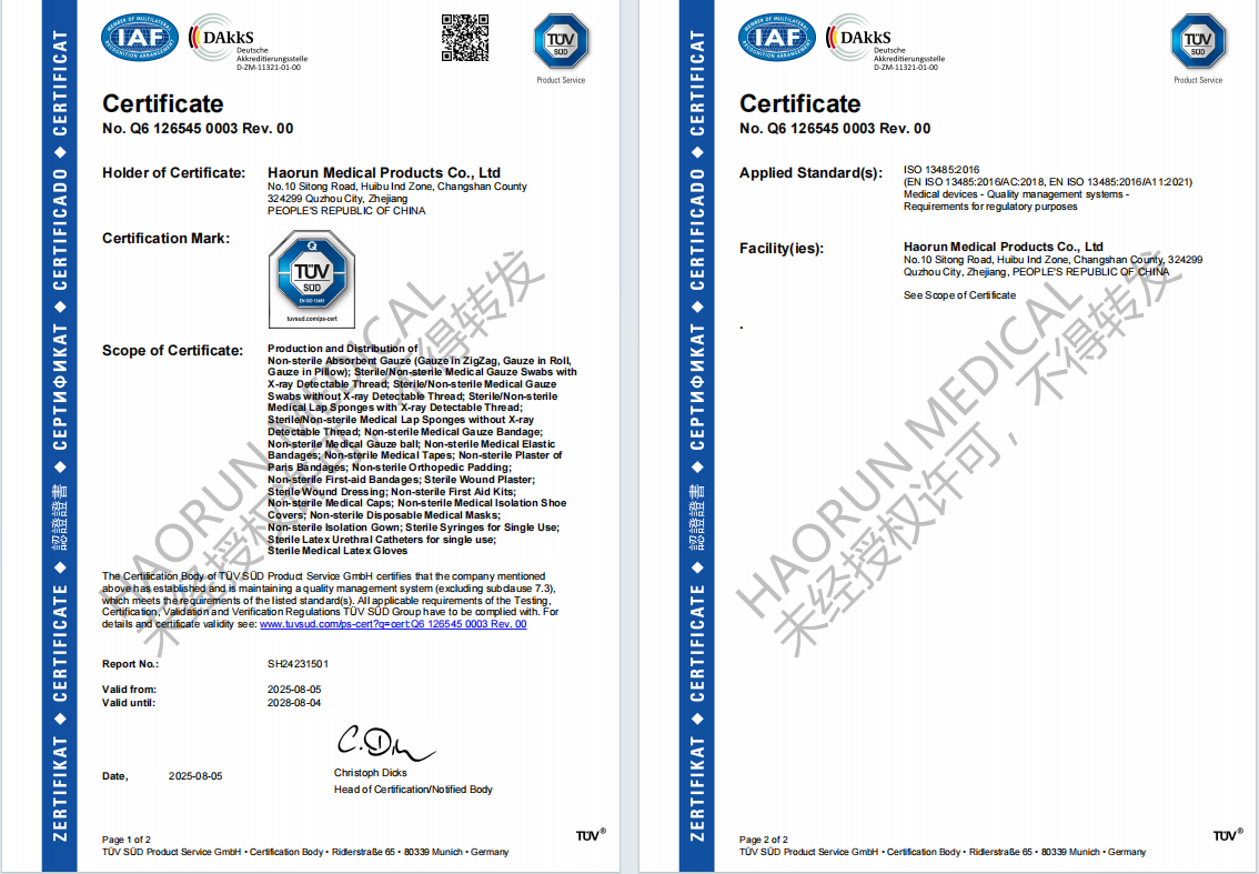 Kanggo nambah katrangan, kita ngrampungake publikasi saka manual manual lan prosedur ing wulan September 2023. Adhedhasar iki, kita nambah dokumen sistem manajemen kualitas ing Januari 2024, nambah konten sing gegandhengan karo MDR. Kita ngliwati tahap pertama ing audit TuV SUD tanggal 10 April 2025, banjur tahap kapindho. Pungkasan, ing wulan Agustus taun iki, nomer sertifikat kasedhiya kanggo ndeleng sistem awak sing ditolak, menehi langkah maju anyar ing sistem manajemen kualitas tinggi Haorm lan nguatake dhasar perusahaan kanggo pembangunan perusahaan. Konsumsi medis sing ora bisa digunakake (gauze, gaun guling, bandages gauze, lsp) nyedhiyakake pelanggan ing saindenging jagad kanthi kualitas produk lan layanan sing unggul.